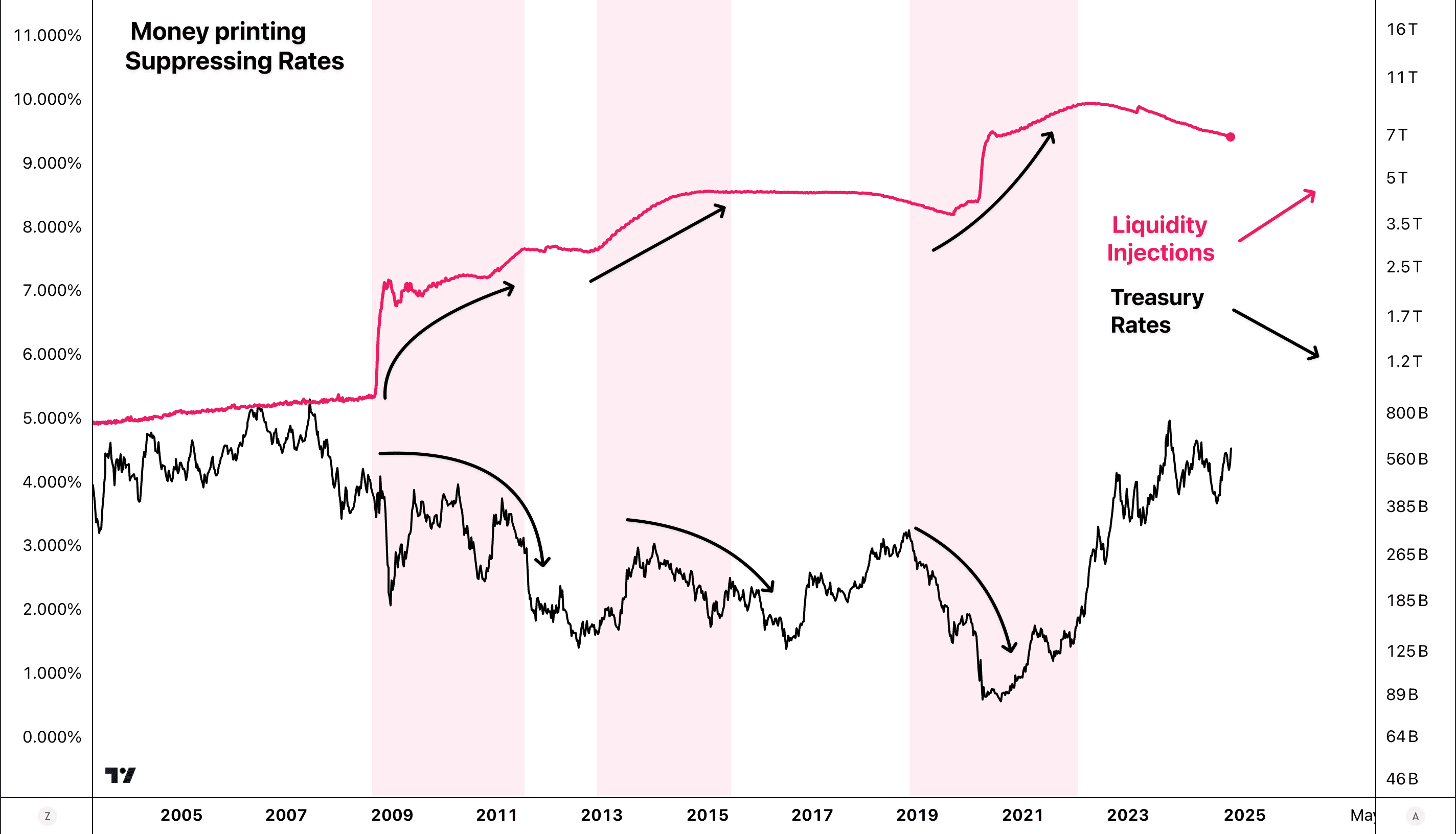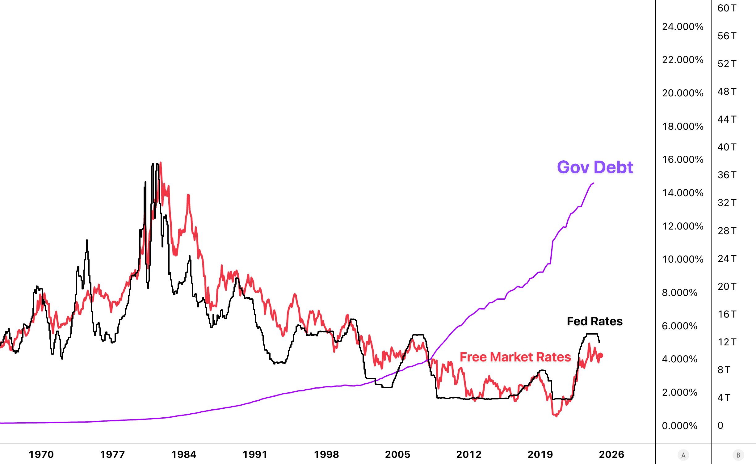 If Free Market Rates rise too high, borrowing costs skyrocket, GDP growth slows, and the risk of financial crises increases. This makes it critical for the government to indirectly suppress long-term rates by implementing policies that ensure borrowing rates remains affordable.