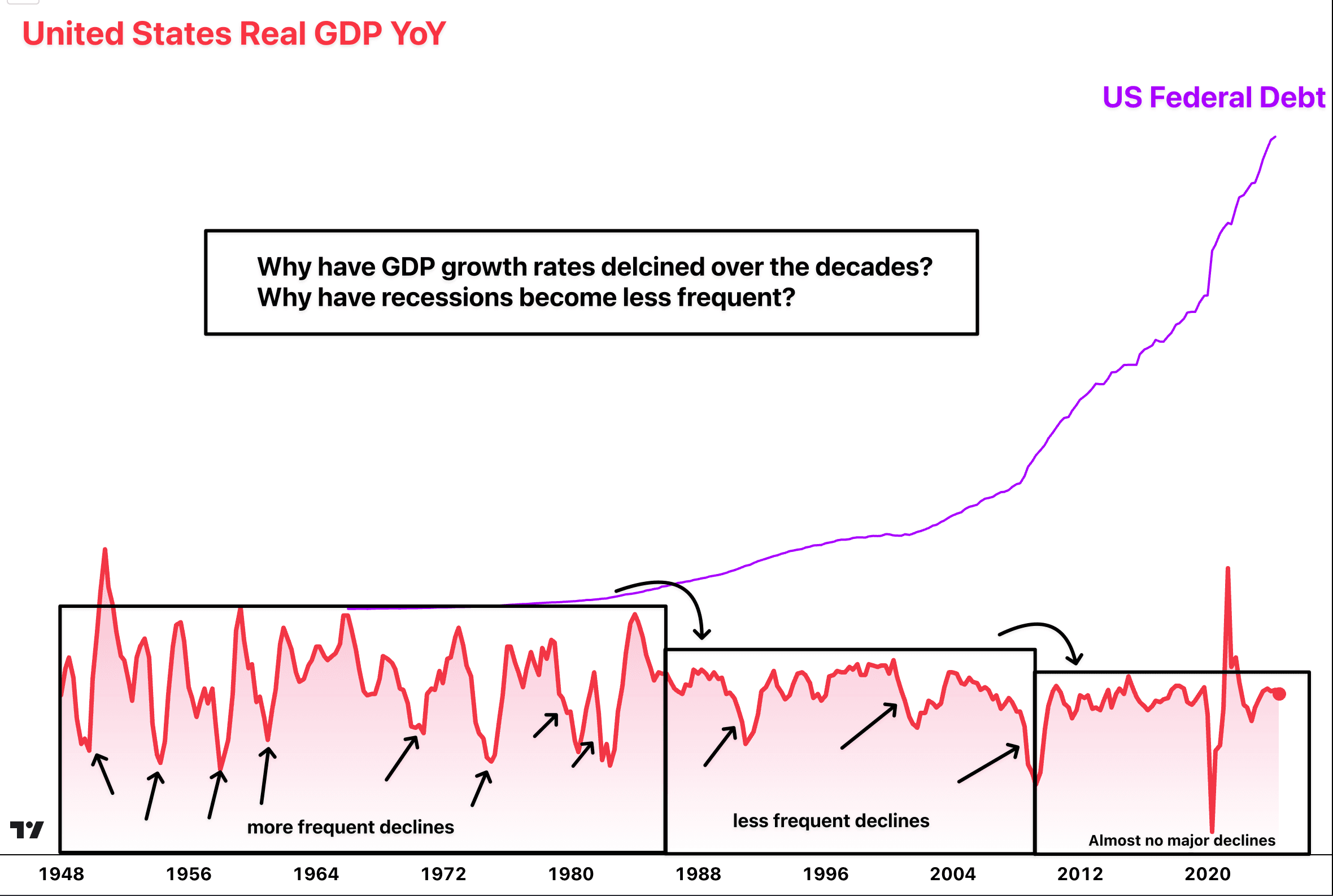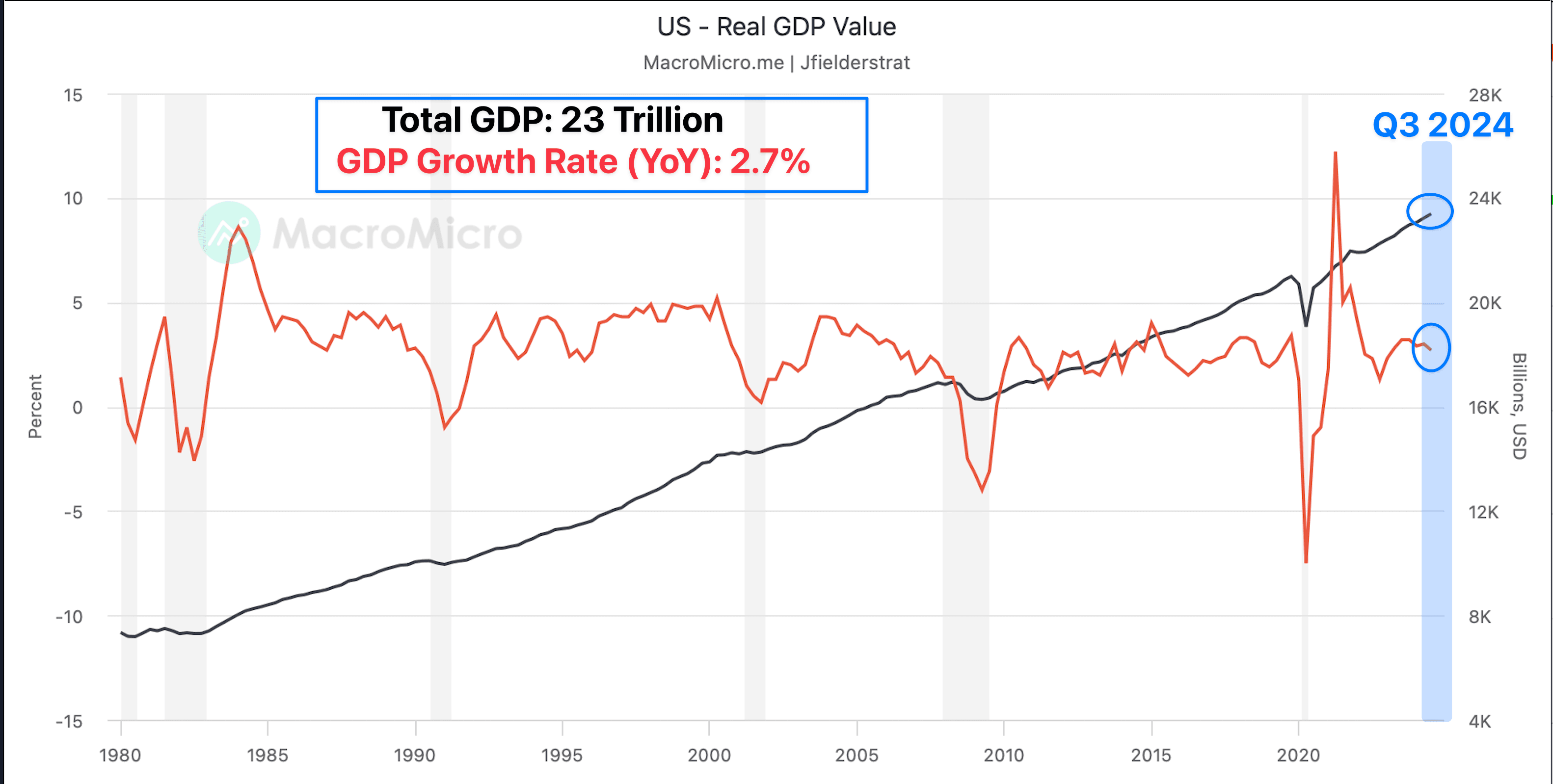 U.S GDP Growth Rate (red) vs Total GDP (black)