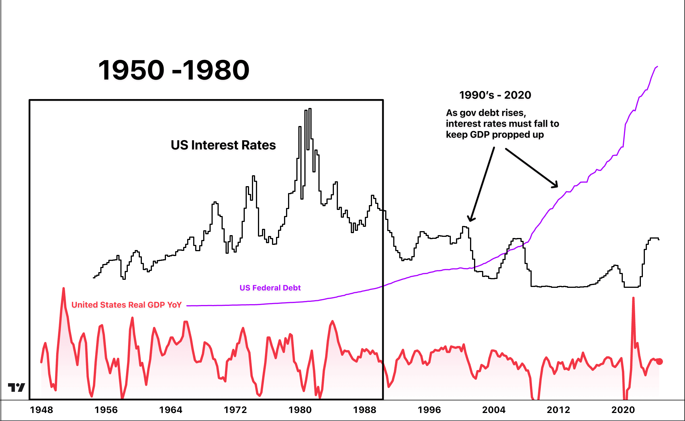 Notice how US short-term rates (black) and GDP growth (red) were much lower after the 1980s. Debt growth (purple) seemed to have exploded in the decade after the 1980s, which led to lower rates to support debt growth.