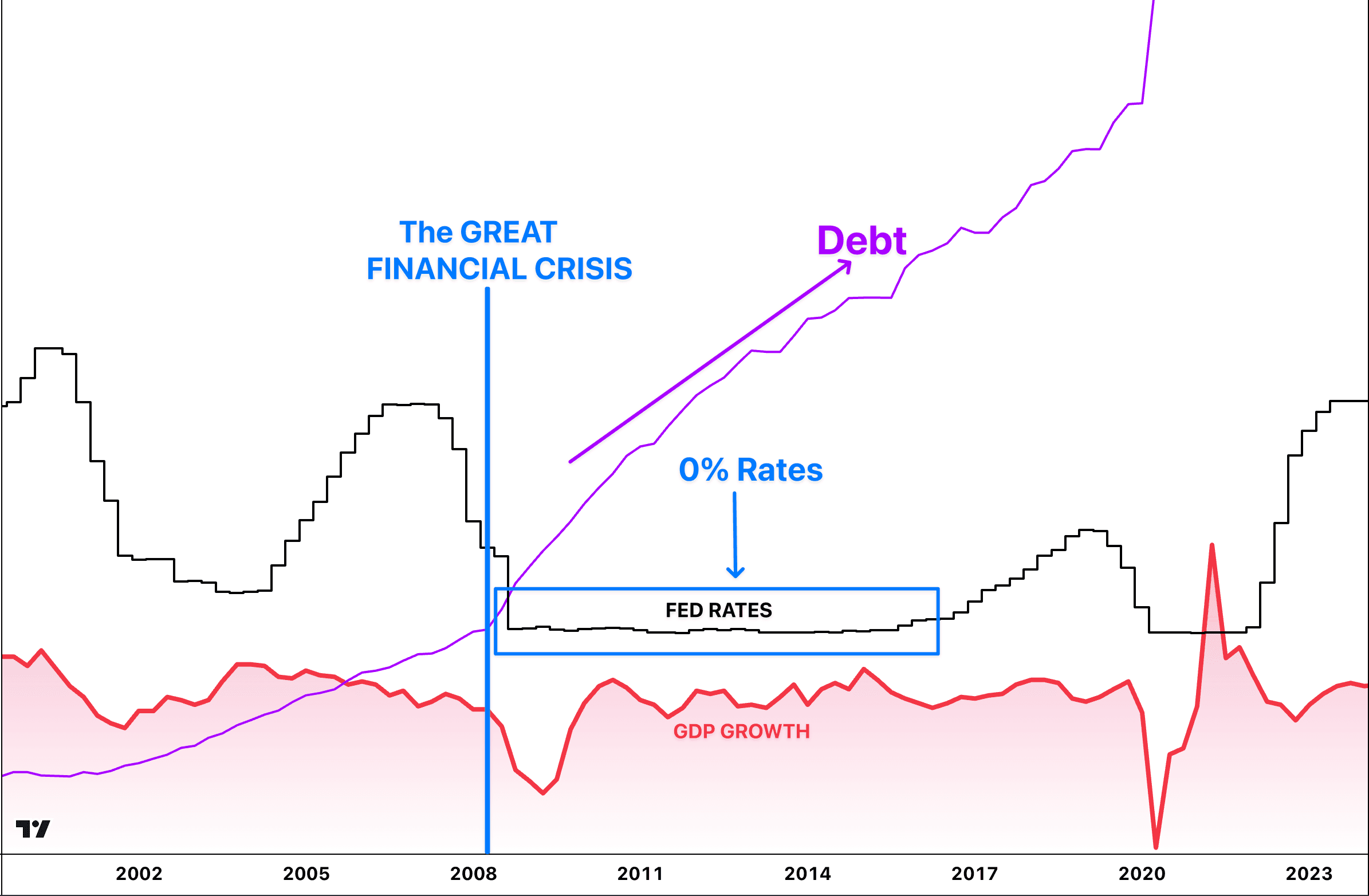 After the Great Financial Crisis, Debt growth (purple) accelerated while short rates (black) were lowered to zero. With 0% rates, GDP (red) still struggled to grow at the rate of previous decades, illustrating how reliant the economy is on debt growth and low debt servicing costs.