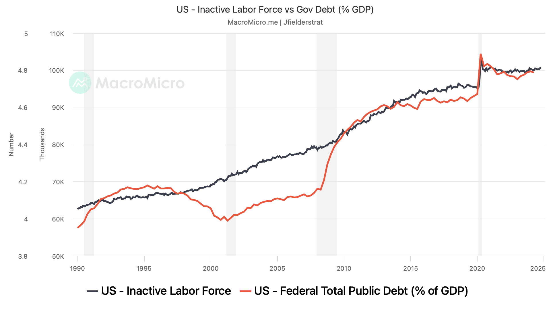 Ironically, the rise in government debt mirrors the rise of inactive workers. As fewer people contribute to economic output, government borrowing becomes the go-to tool for stimulating growth.