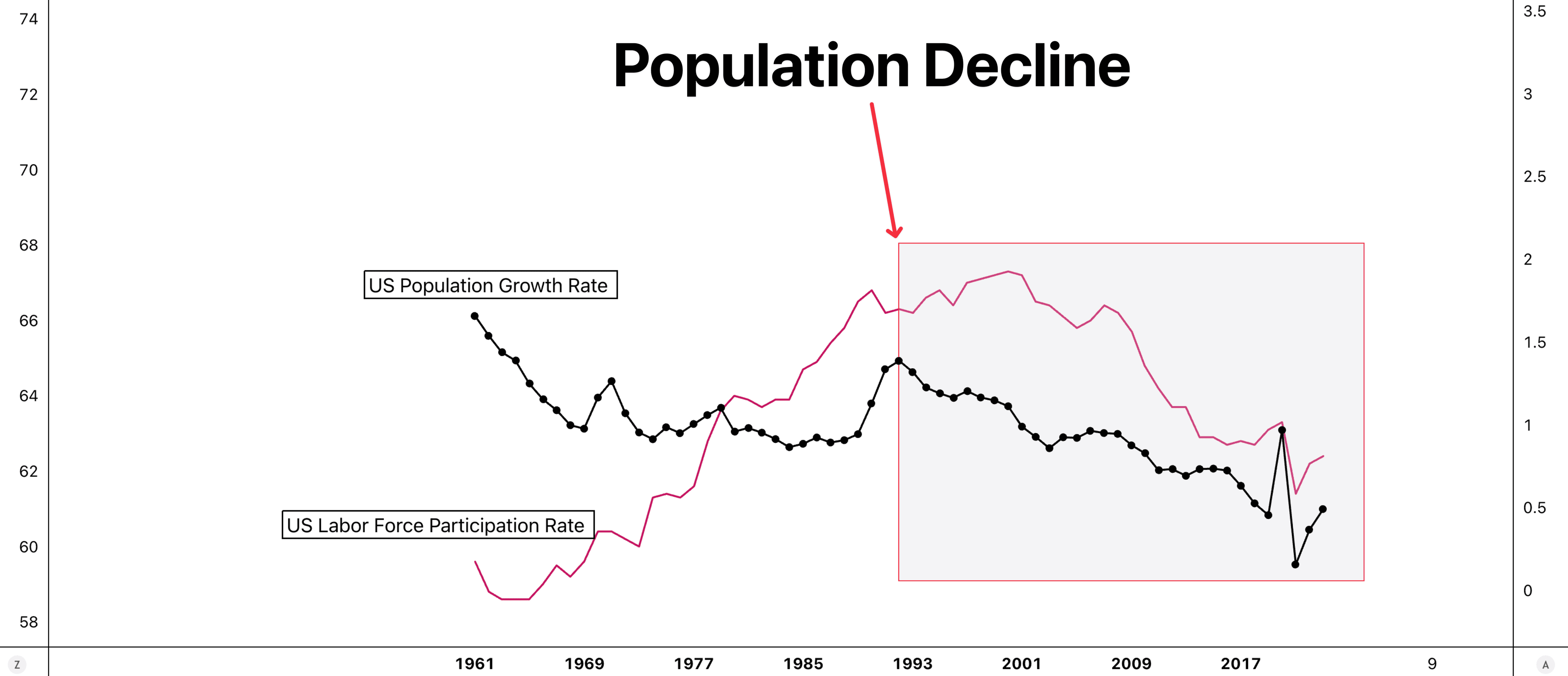 Population growth directly boosts GDP growth by increasing the number of workers (labor force)—more people working means more economic output and more spending. However, in the U.S., population growth peaked in the mid-1990s, while the labor force participation rate has steadily declined since the early 2000s.